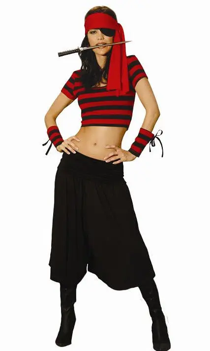 6 piece costume includes: black gaucho pants, black and red crop top, matching arm bands, red head scarf, eye patch and dagger