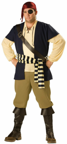Prepare for an evening of pillage and plunder in the Pirate Rogue ensemble which includes: A lace up renaissance style shirt with an attached navy sleeved vest, a faux-leather chest strap with intricately designed buckle, red velvet head scarf, striped waist sash, and faux-leather swashbuckler boot covers. Grab some rum and your favorite lass and your evening of piracy will be first class.