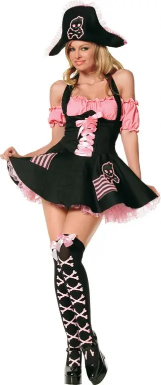 Let’s Go On A Treasure HuntCostume Includes: Lace up front peasant dress, striped panty, and hat with skull and bone applique. Available sizes: